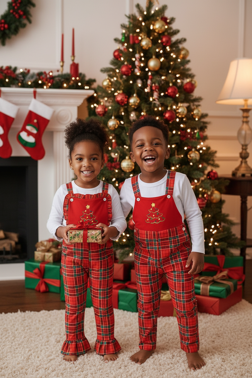 Perfect for holiday photos, Christmas morning, school parties, and coordinated sibling outfits — this Red Plaid Christmas Overalls Set is designed for busy moms who want cute, comfortable holiday outfits without the stress of finding matching pieces.